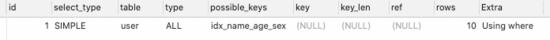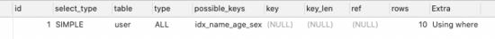 EXPLAIN SELECT * FROM `user` WHERE name = '冰峰' AND sex = '男';