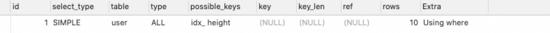 这个SQL诸位一定要看清楚,height表字段类型是varchar,但是我查询的时候使用了数字类型,因为这个中间存在一个隐式的类型转换,所以就会导致索引失效,进行全表扫描。