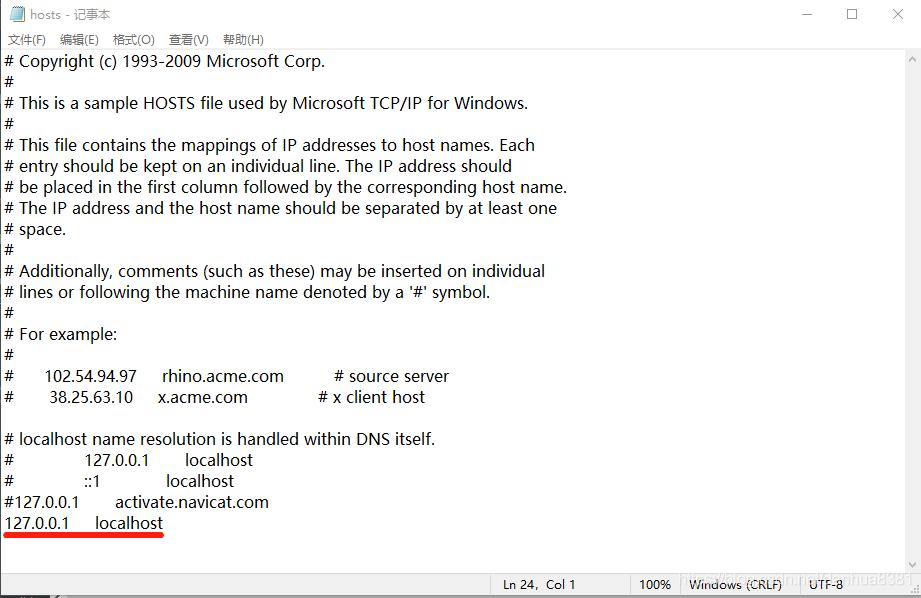 2.将所有指向127.0.0.1的网址注掉,并添加一条新纪录,将127.0.0.1指向localhost