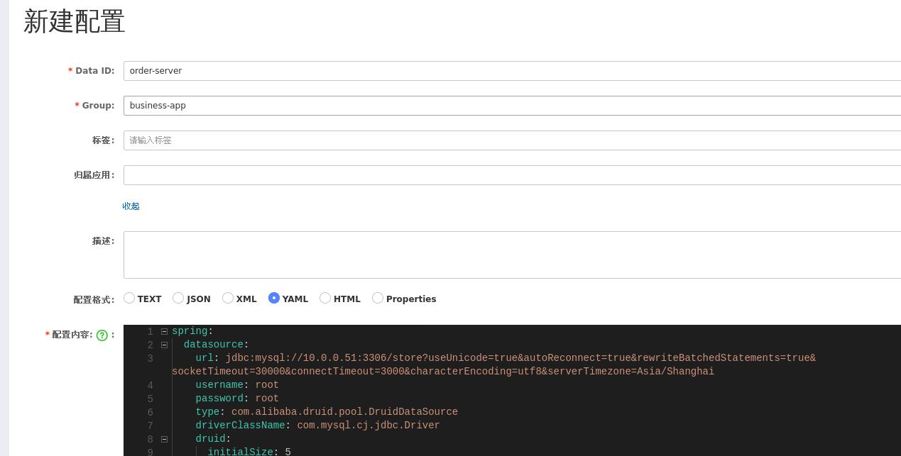 从日志可以看到他会从nacos上匹配 based on dataId[order-server-dev.yml] & group[business-app] 和 [order-server.yml] & group[business-app] 配置文件。并且项目也是启动成功的,因为项目中加入了数据库的pom,如果没有获取到配置会启动失败。
