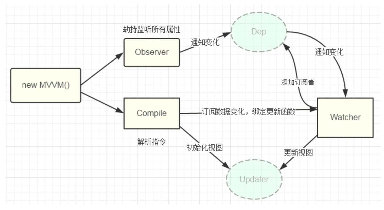 MVVM作为数据绑定的入口,整合Observer、Compile和Watcher三者,通过Observer来监听自己的model数据变化,通过Compile来解析编译模板指令,最终利用Watcher搭起Observer和Compile之间的通信桥梁。