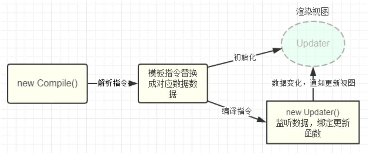compile主要做的事情是解析模板指令,将模板中的变量替换成数据,然后初始化渲染页面视图,并将每个指令对应的节点绑定更新函数,添加监听数据的订阅者,一旦数据有变动,收到通知,更新视图,如图所示: