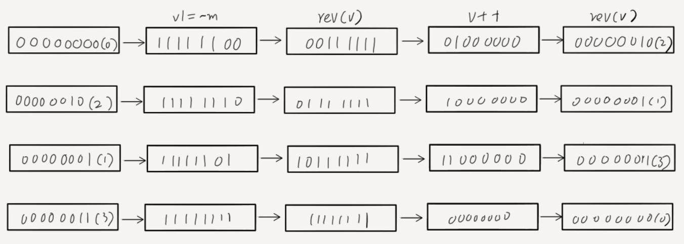 v |= ~m0;//或者m1 /* Increment the reverse cursor */ v = rev(v); v++; v = rev(v);