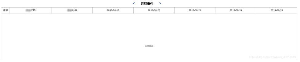 <div class="calendar-title"> <span class="calendar-left" @click="lastDateclick"><</span> <span class="calendar-center">近期事件</span> <span class="calendar-right" @click="nextDateclick">></span> </div> <el-table ref="table"t :data="filterData" border stripe> <el-table-column align="center" type="index" width="50" label="序号"></el-table-column> <el-table-column align="center" prop="code" label="代码"> </el-table-column> <el-table-column align="center" prop="name" label="名称"></el-table-column> <el-table-column align="center" v-for="(item,index) in dateArr" :key="index + item" :label="item"> <template slot-scope="scope"> <span v-html="dateInfoDesc(item,scope.row)"></span> </template> </el-table-column> </el-table>