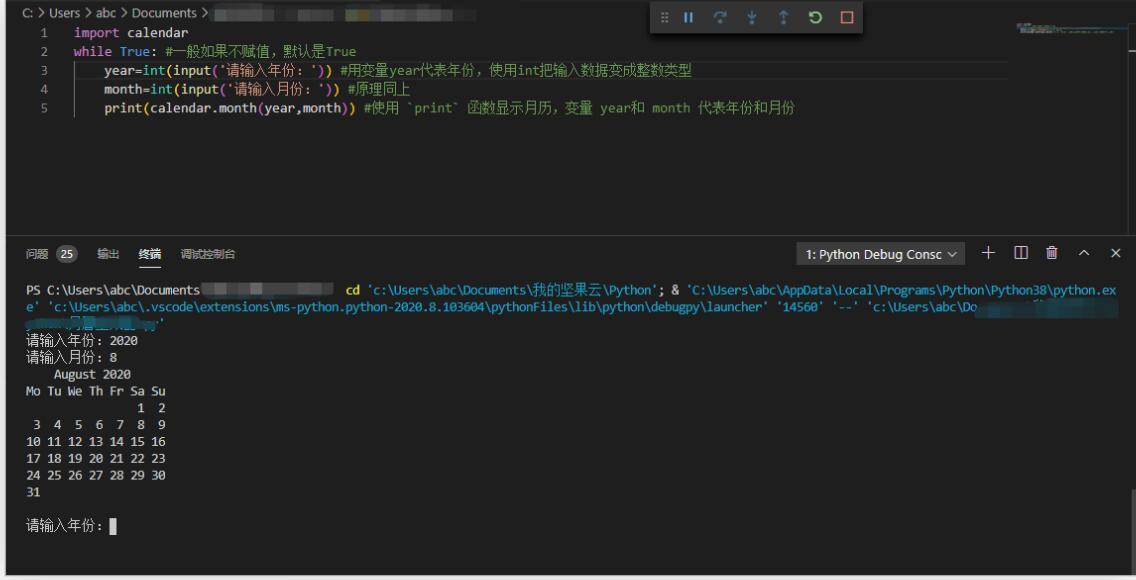 print(calendar.month(year,month)) #使用 `print` 函数显示月历,变量 year和 month 代表年份和月份