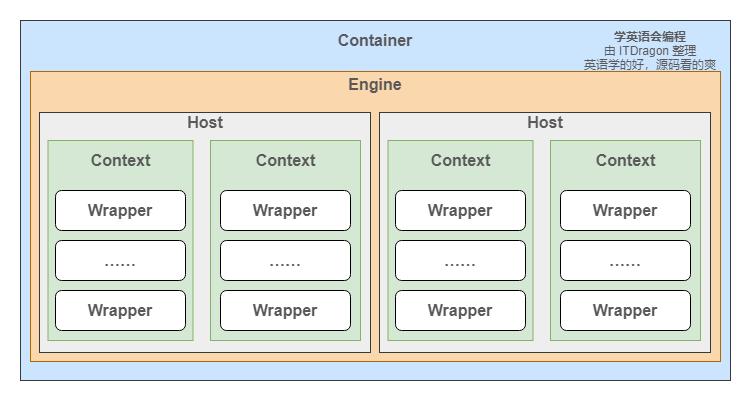 每个 Service 会包含一个容器。容器由一个引擎可以管理多个虚拟主机。每个虚拟主机可以管理多个 Web 应用。每个 Web 应用会有多个 Servlet 包装器。Engine、Host、Context 和 Wrapper,四个容器之间属于父子关系。