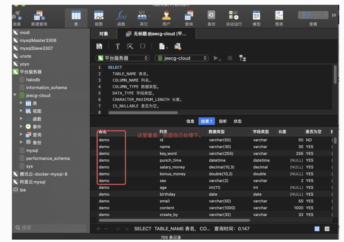 SELECT TABLE_NAME 表名, COLUMN_NAME 列名, COLUMN_TYPE 数据类型, DATA_TYPE 字段类型, CHARACTER_MAXIMUM_LENGTH 长度, IS_NULLABLE 是否为空, COLUMN_DEFAULT 默认值, COLUMN_COMMENT 备注 FROM INFORMATION_SCHEMA.COLUMNS where -- developerclub为数据库名称,到时候只需要修改成你要导出表结构的数据库即可 table_schema ='developerclub'