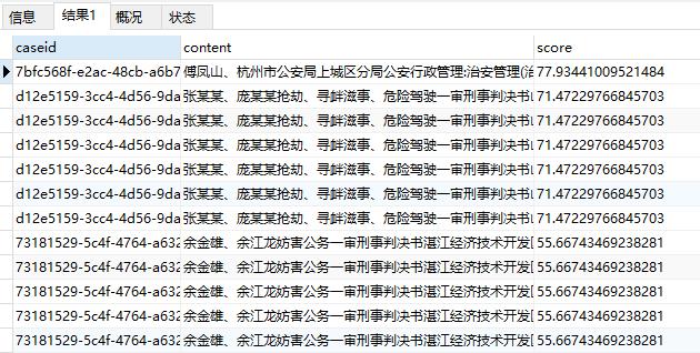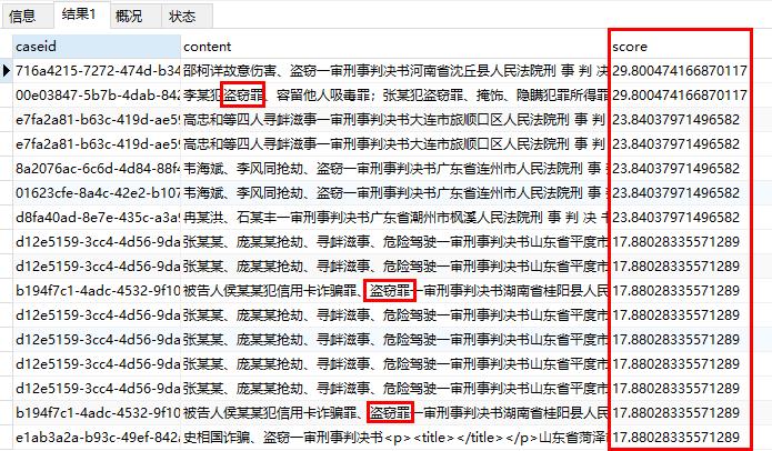 select caseid,content, MATCH ( content) AGAINST ('盗窃罪') as score from t_wenshu where MATCH ( content) AGAINST ('盗窃罪' IN NATURAL LANGUAGE MODE)
