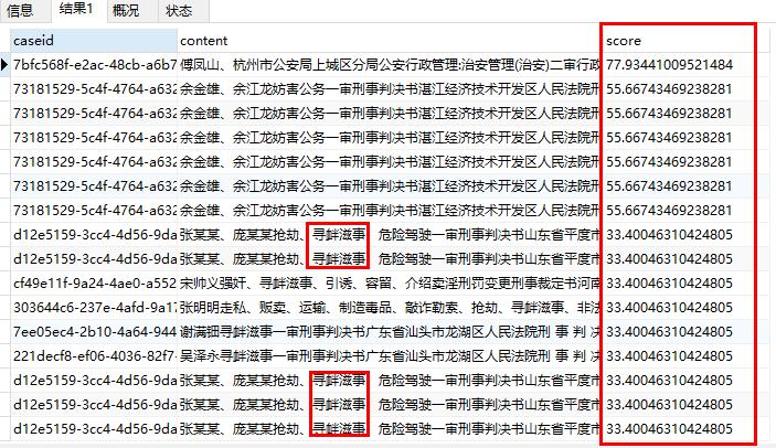 2)查询 content 中包含“寻衅滋事”的记录,查询语句如下