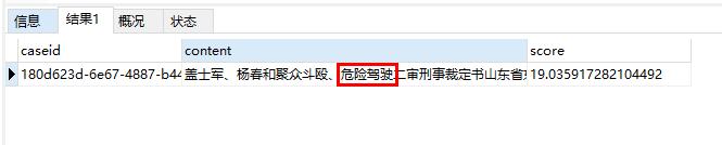 5)查询字段 content 中包含 “危险驾驶”,但不包含“寻衅滋事”的语句如下: