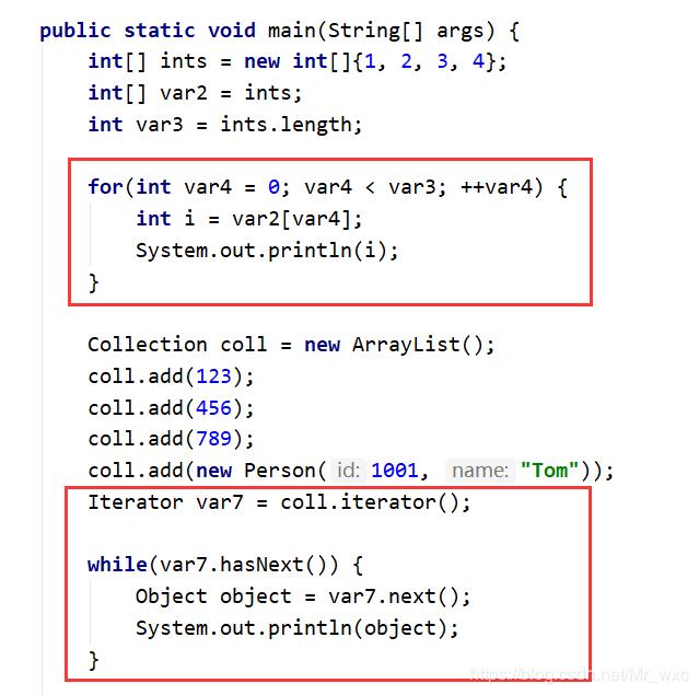 由编译后的源码可知,使用foreach循环遍历数组时,底层仍然是通过for循环实现的;而遍历集合时,底层是通过迭代器实现的。