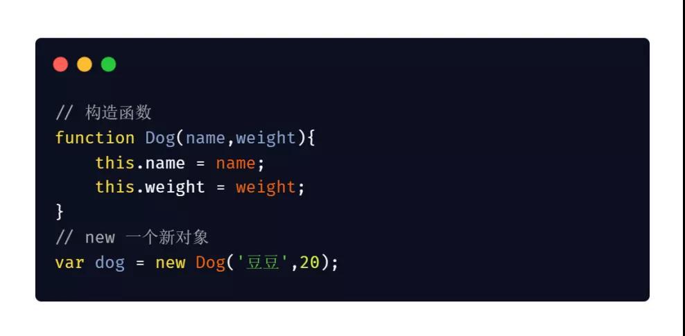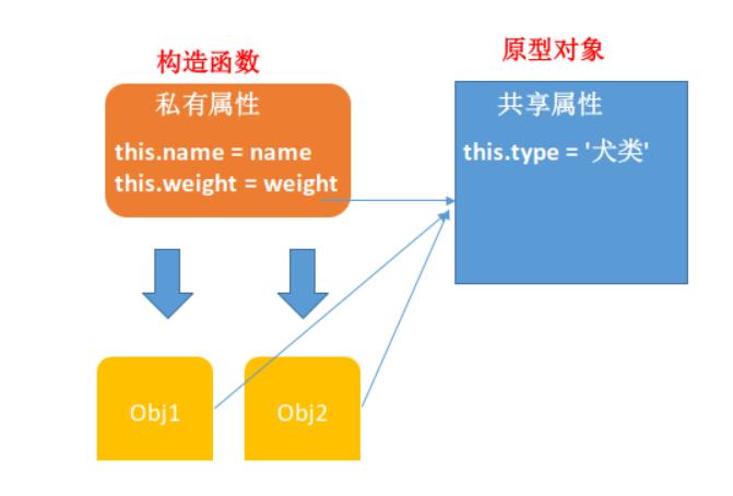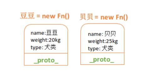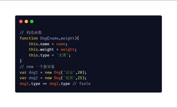 我们通过 new 构造函数生成两个狗的对象实例,一个叫豆豆,一个叫贝贝,这两个是两个不同的对象,名字体重都不相同,但是他们会共享原型对象上的属性 type,它们共有的属性都是犬类。