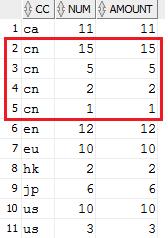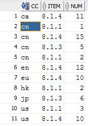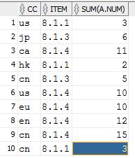 11条记录经group by后为10条,其中cc='cn' and item='8.1.1'对应的两条记录的num汇总成值3.