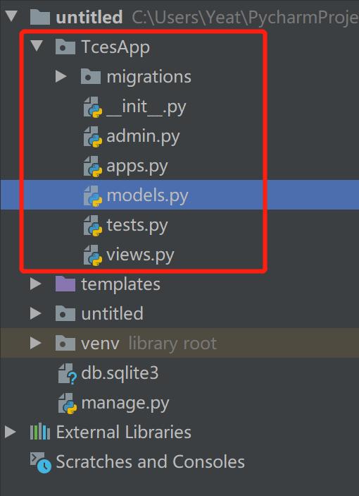 1.进入项目工程目录执行命令:django-admin startapp TcesApp,我的完整命令是:C:\Users\Yeat\PycharmProjects\untitled>django-admin startapp TcesApp,前面的部分是我的工程目录路径;