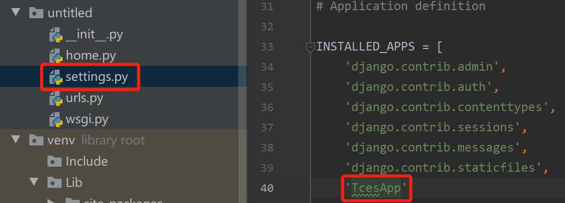 5.在setting.py中添加app名称(上边的名称 django-admin startapp TcesApp 的名称):