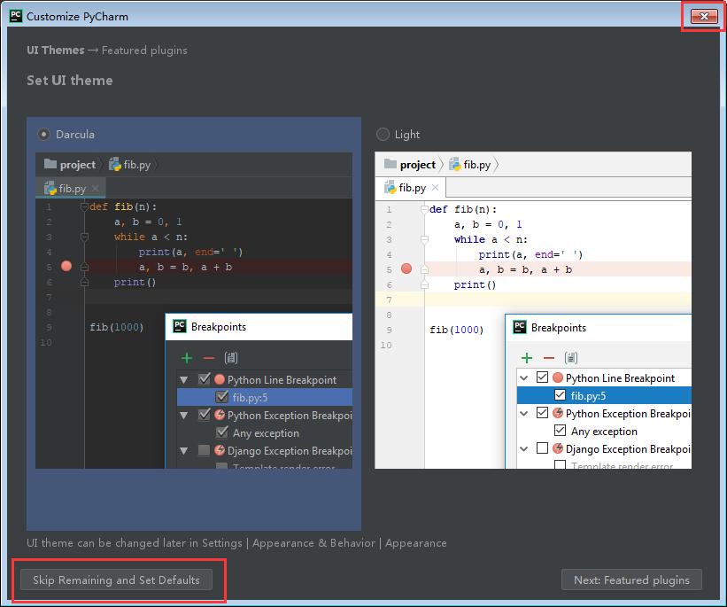 第十二步:可以右上角关掉,也可以左下角:skip remaining and set defaults(跳过其余和设置默认值)
