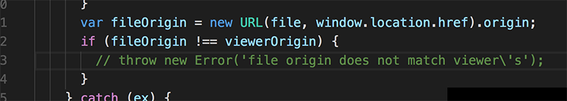 如果不注释,当viewer.html页面的域和pdf文件域不一致的时候会报错,如下图: