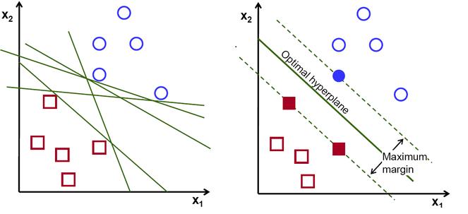 如上图中,在二维平面中,有红和蓝两类点。要对这两类点进行分类,可以有很多种分类方法,就如同图中多条绿线,都可以把数据分成两部分。