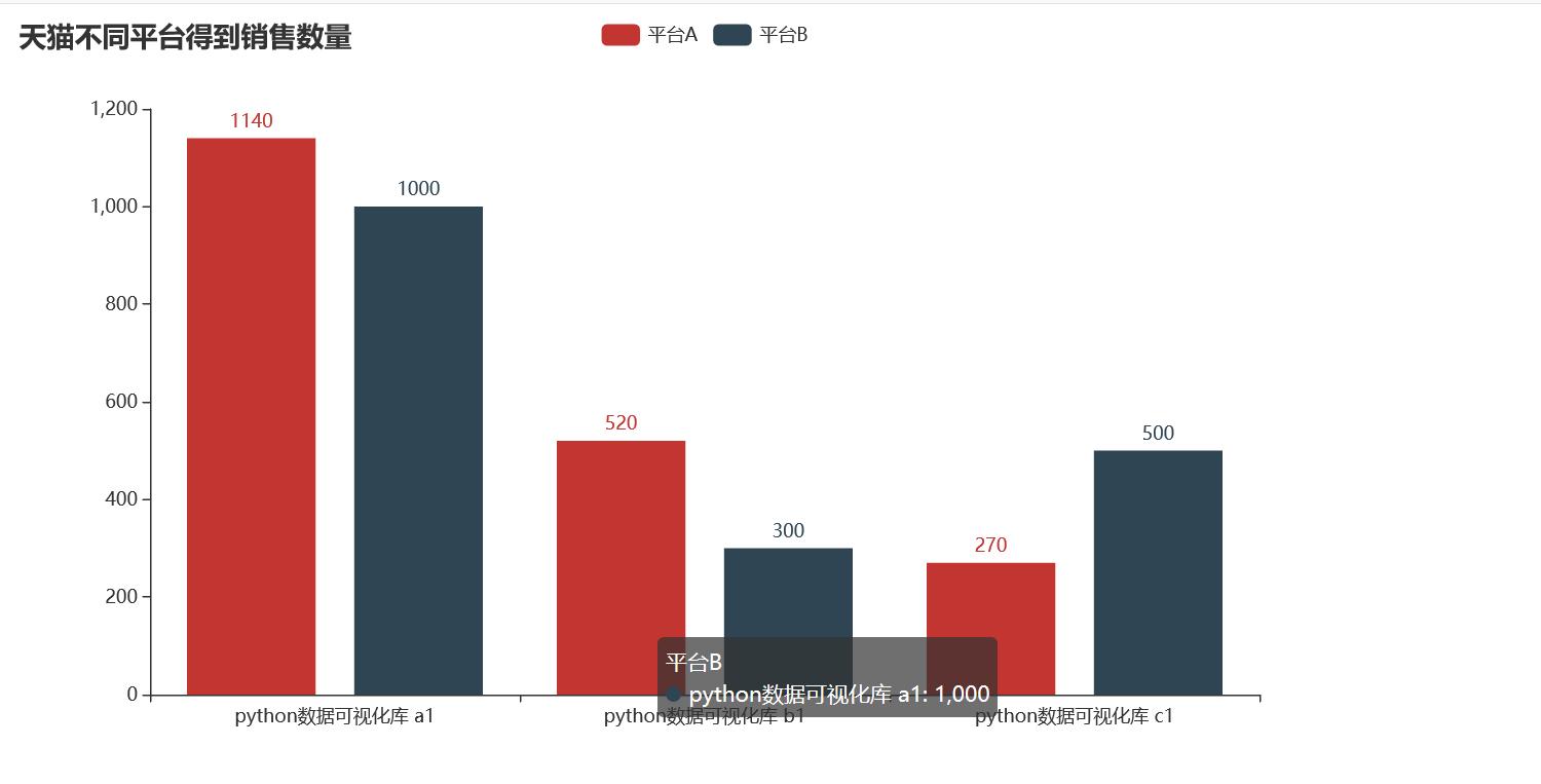 pip3 install pyechatrs #! /usr/bin/python3 from pyecharts.charts import Bar, Page from pyecharts import options as opts x = [ 'python数据可视化库 a1','python数据可视化库 b1','python数据可视化库 c1' ] y1 = [ 1140,520,270 ] y2 = [1000,300,500] bar = Bar() #设置x轴 bar.add_xaxis(xaxis_data=x) #设置y轴 bar.add_yaxis(series_name='平台A',y_axis=y1) bar.add_yaxis(series_name='平台B',y_axis=y2) bar.set_global_opts(title_opts=opts.TitleOpts(title='天猫不同平台得到销售数量')) #生成html文件 bar.render(path='first_bar.html')