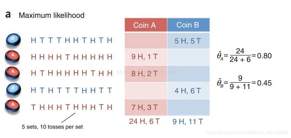 这是一个抛硬币的例子,H表示正面向上,T表示反面向上,参数θ表示正面朝上的概率。硬币有两个,A和B,硬币是有偏的。本次实验总共做了5组,每组随机选一个硬币,连续抛10次。如果知道每次抛的是哪个硬币,那么计算参数θ就非常简单了,如