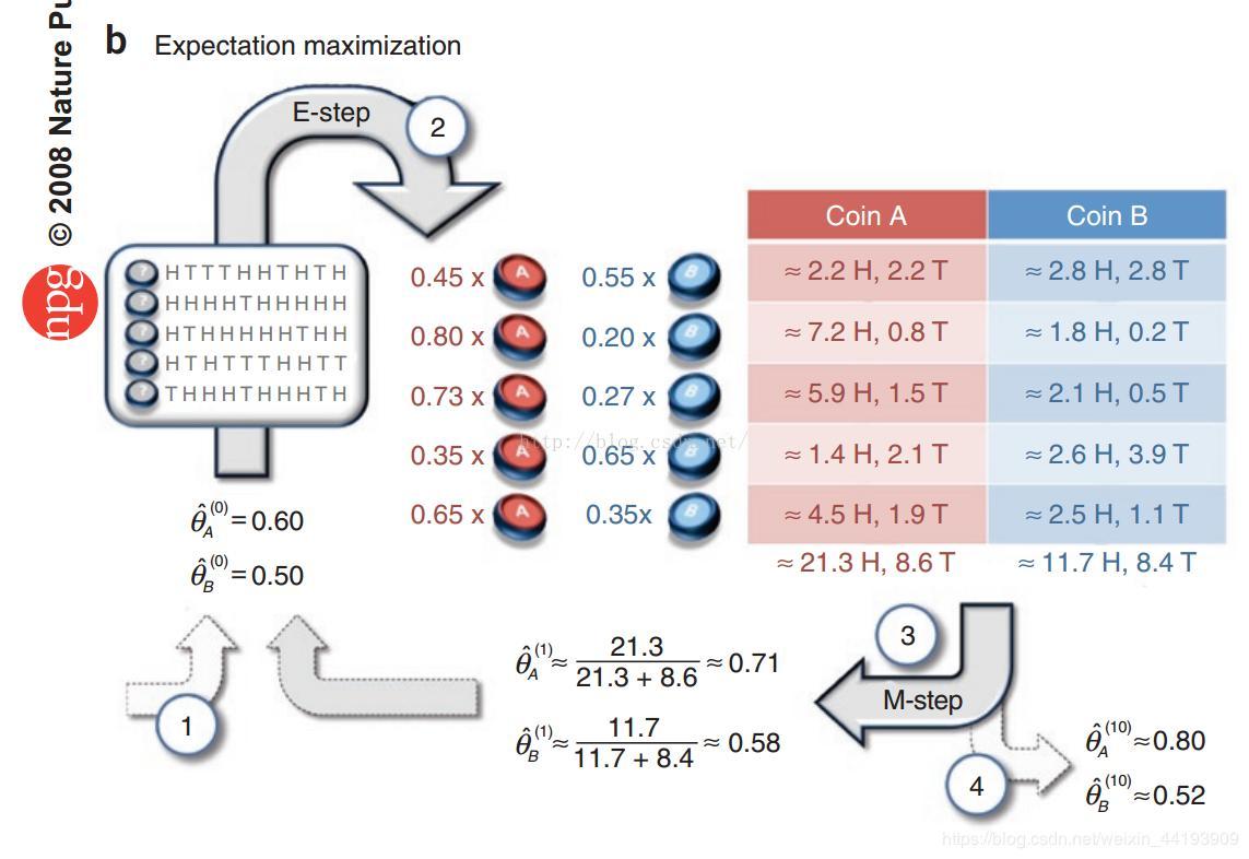如果不知道每次抛的是哪个硬币呢?那么,我们就需要用EM算法,基本步骤为: