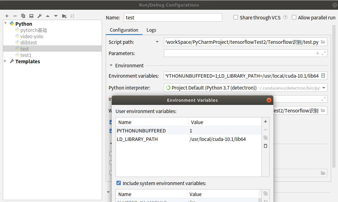 选择pycharm 菜单栏Run ――> Run-Edit Configurations ――> Environment variables――> 将cuda的路径加进去 例如:LD_LIBRARY_PATH=/usr/local/cuda-10.1/lib64
