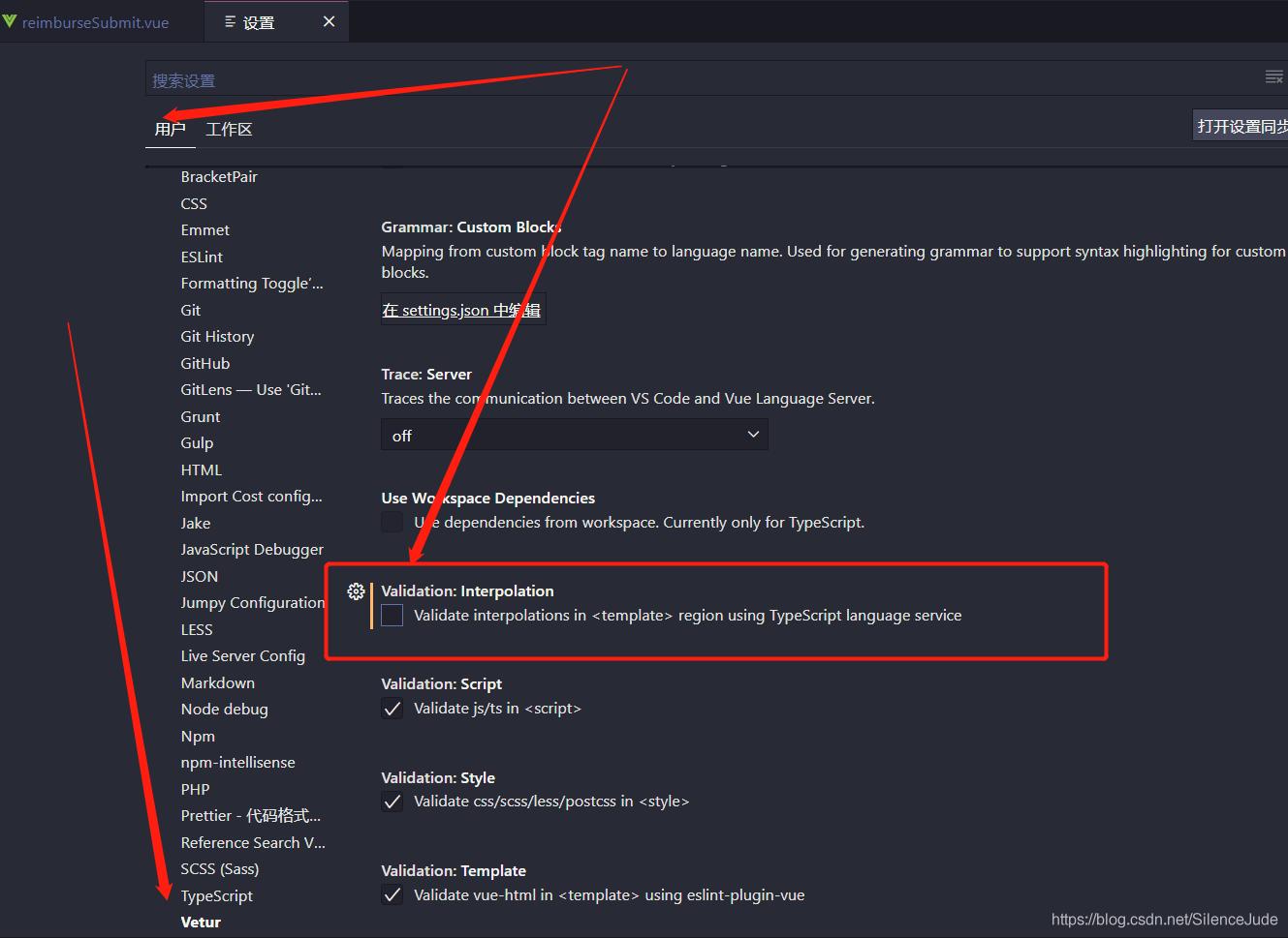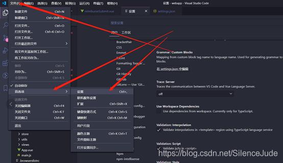 依次点击:文件――首选项――设置,在打开的页面点击,用户――拓展――vetur