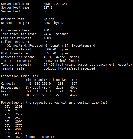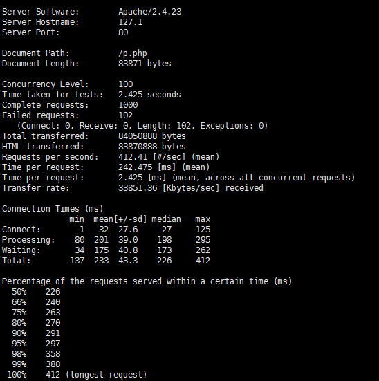 Apache + mod_php 测试结果是每秒完成 412 次请求。