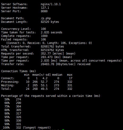 Nginx + php-fpm 测试结果是每秒完成 352 次请求。FastCGI 的进程间通讯还是拉低了性能。