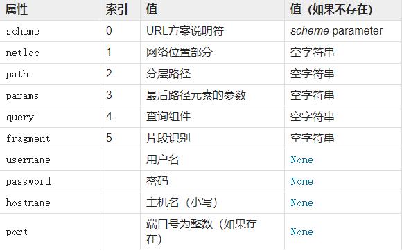 >>> from urllib import parse >>> url = 'https://mp.weixin.qq.com/s?__biz=MjM5MzgyODQxMQ==&mid=2650366919&idx=1&sn=1b36a9f2c0921cdeac52942ec591a923#rd' >>> result = parse.urlparse(url) # 返回ParseResult对象 >>> print(result) ParseResult(scheme='https', netloc='mp.weixin.qq.com', path='/s', params='', query='__biz=MjM5MzgyODQxMQ==&mid=2650366919&idx=1&sn=1b36a9f2c0921cdeac52942ec591a923', fragment='rd') # 通过下标获取协议 >>> result[0] 'https' # 协议 >>> result.scheme 'https' # url资源路径 >>> result.path '/s' # 查询参数 >>> result.query '__biz=MjM5MzgyODQxMQ==&mid=2650366919&idx=1&sn=1b36a9f2c0921cdeac52942ec591a923' # 获取主机名 >>> result.hostname 'mp.weixin.qq.com'