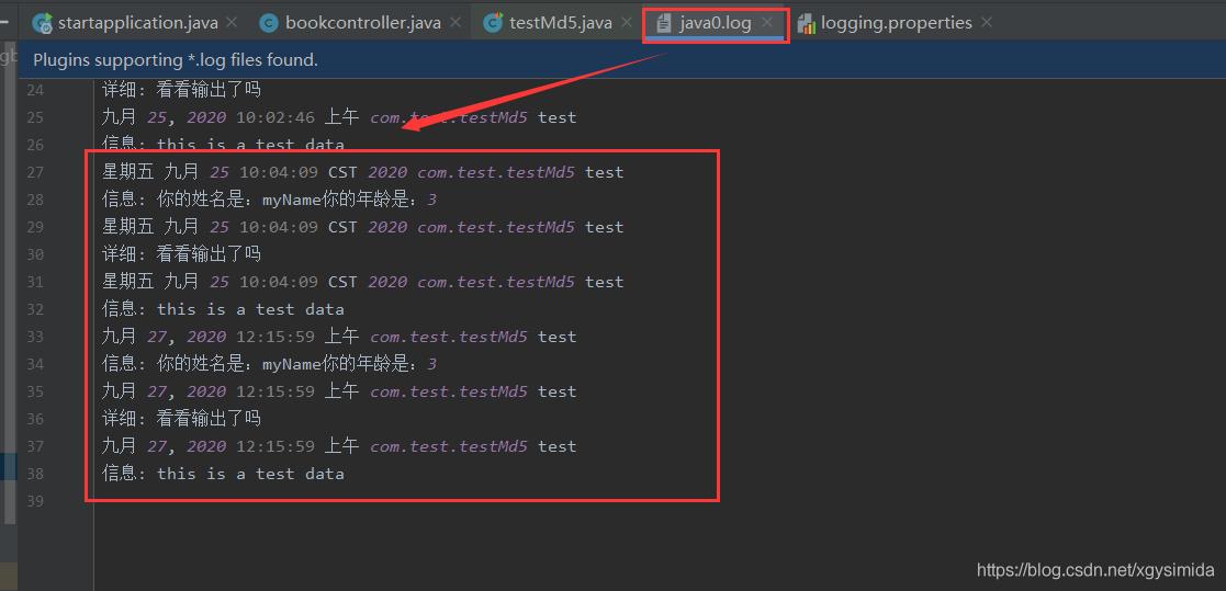 #输出两种方式 handlers= java.util.logging.FileHandler, java.util.logging.ConsoleHandler .level= FINE #对日志的输出进行设置(主要是file类) #java.util.logging.FileHandler.pattern = %h/java%u.log #下面的是输出到制定的目录下 java.util.logging.FileHandler.pattern = D:\\software\\idea\\idealianxicode\\springboot1\\src\\main\\resources/java%u.log #日志限制大小 java.util.logging.FileHandler.limit = 5000 java.util.logging.FileHandler.count = 1 #设置输出格式 java.util.logging.FileHandler.formatter = java.util.logging.SimpleFormatter #对文件设置输出编码格式(因为包含中文字符) java.util.logging.FileHandler.encoding = UTF-8 #对日志进行追加 java.util.logging.FileHandler.append = true #下面主要是为控制台设置输出格式 java.util.logging.ConsoleHandler.level = FINE java.util.logging.ConsoleHandler.formatter = java.util.logging.SimpleFormatter