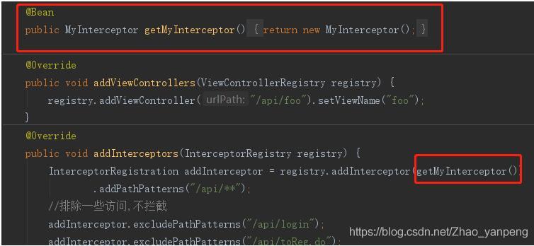 知道拦截器执行在bean实例化前执行的,那么我们就让拦截器执行的时候实例化拦截器Bean,在拦截器配置类里面先实例化拦截器,然后再获取