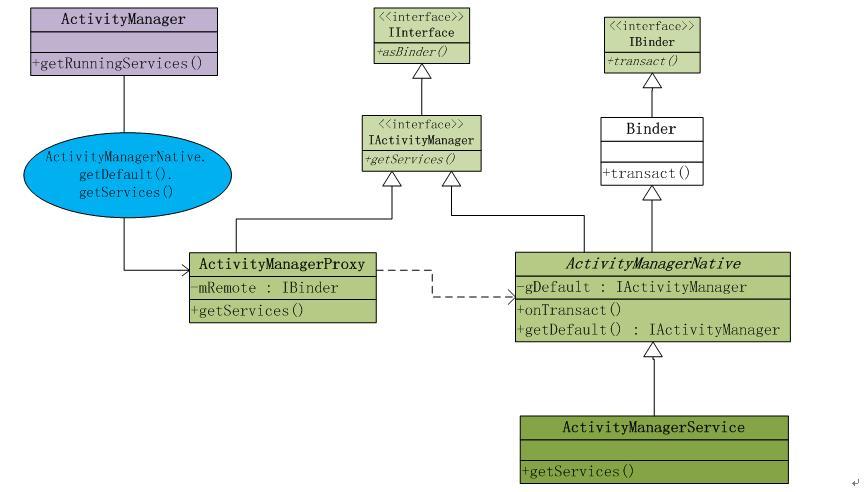 从图中可以看出代理类:使用ActivityManagerProxy代理类,来代理ActivityManagerNative类的子类ActivityManagerService;