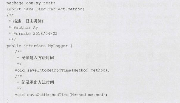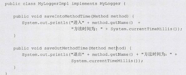 • savelntoMethodTime : 记录进入方法的时间。 • saveOutMethodTime : 记录退出方法的时间。 接口类MyLogger 开发完成之后,用MyLoggerlmpl 类实现它, 具体代码如下: