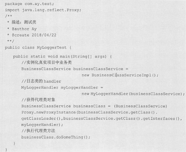 实现类BusinessClassServicelmpl 实现了BusinessClassServ ice 接口, 并实现了doSomeThing 方法,在方法中打印“ do something ......” 。接着,开发日志接口类My Logger , 具体代码如下: