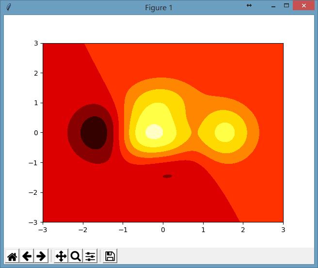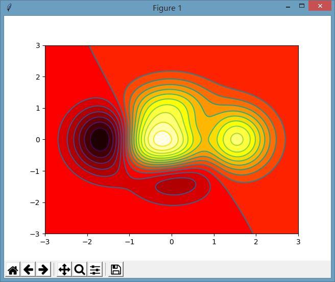 这颜色有点太冷了,我们想显示热力图,那只要在plt.contourf()函数中添加属性cmap=plt.cm.hot就能显示热力图,其中cmap代表为color map,我们把color map映射成hot(热力图),此处关键代码为: