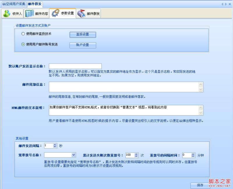 3、 邮件发送可以选择两种方式,下面将分别介绍这两种方式的实现,一种采用该控件封装非常好的邮件直投技术,不需要SMTP账号发送的;一种是普通的SMTP发送方式。当然我们还可以设置更多的参数,例如邮件尾部信息、HTML内容提示、 以及一些发送期间自动拨号的设置操作等。