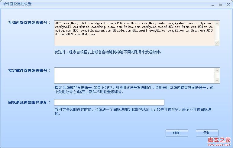 4、 邮件直投技术,通过模拟账户来附加用户的邮件地址(或者可以成为伪装)。其中我填写了一些常用的SMTP服务器的域名,方便在其中构造合乎要求的邮件格式,还可以设置邮件回执通知,如下图所示。