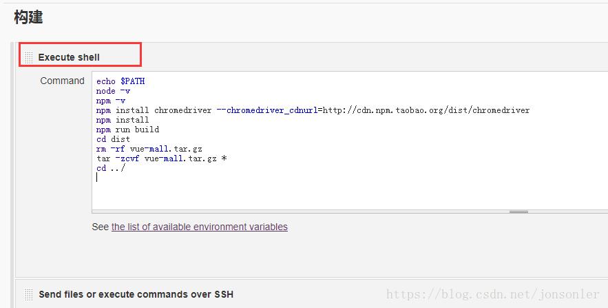 echo $PATH node -v npm -v npm install chromedriver --chromedriver_cdnurl=http://cdn.npm.taobao.org/dist/chromedriver npm install npm run build cd dist rm -rf vue-mall.tar.gz tar -zcvf vue-mall.tar.gz * cd ../