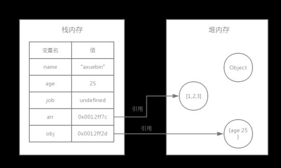 此时 name , age , job 三种基本数据类型是直接存在栈内存中的,而 arr , obj 在栈内存中只是存了一个地址来表示对堆内存中的引用。