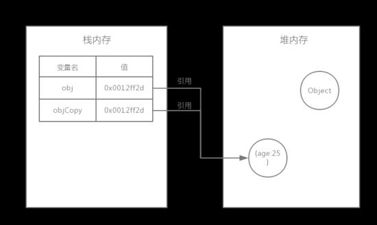 如果所示,执行了 var objCopy=obj 之后, obj 和 objCopy 具有相同的地址值,执行堆内存中的同一个实际对象。