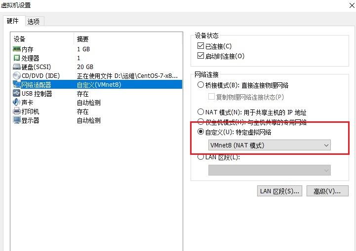 2.打开虚拟机设置,网络适配器中的网络连接选择自定义VMnet8(NAT模式)