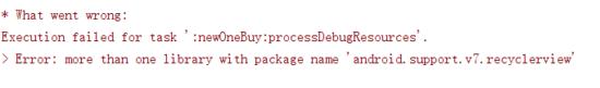 错误提示中可以看到是因为有多个同名的库报错,因为我从eclipse导出项目时就自带了supportV7的recyclerview的库,而我刚刚有添加了新的recyclerview库,所以二者重复依赖了,解决办法很简单,去除之前的recyclerview依赖即可,问题解决! ###问题3 清单文件合并出错 Manifest merger failed