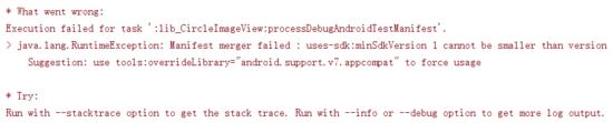 java.lang.RuntimeException: Manifest merger failed : uses-sdk:minSdkVersion 1 cannot be smaller than version 7 declared in library [com.android.support:appcompat-v7:23.2.1] D:\studioCode\NewOneBuy\lib_CircleImageView\build\intermediates\exploded-aar\com.android.support\appcompat-v7\23.2.1\AndroidManifest.xmlSuggestion: use tools:overrideLibrary="android.support.v7.appcompat" to force usage