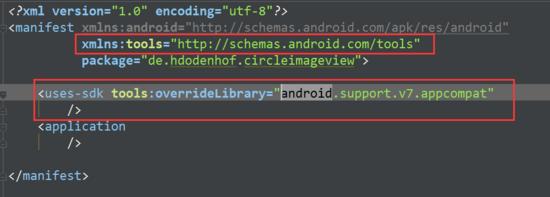 可以看到是是因为circleimageview的minSdkVersion低于appcompatV7定义的version而导致的清单文件合并出错,提示中也告诉了我们解决方法,只要在circleimageview的清单文件中配置好即可。