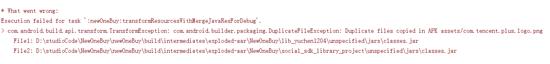 这个问题也简单,定位到相关的代码,使用快捷键:ctrl+alt+O, 去除无效的导包即可。 ###问题5 重复文件(jar包) Duplicate files