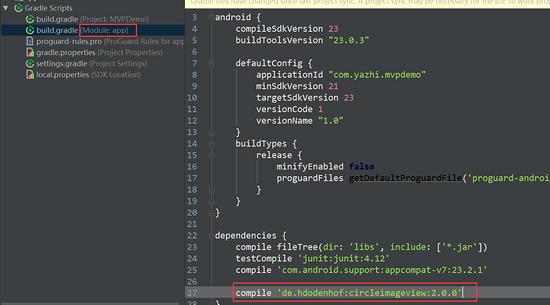 但是如果是添加线上开源库的话,二者的差距就体现出来了,以往在github上看到优秀的开源库,想要应用到自己的项目中,就得先把项目下载下来,然后再添加依赖,虽然操作不繁琐,但是我渐渐发现github上越来越多的开发者都转向AS,不再单独提供eclipse上使用的版本。这个不赘述,因为想转平台,能看到这篇博客的朋友,肯定或多或少都有些同感。总之一句话: google大法好 。退eclipse保平安,赶紧转AS吧。 ##初识gradle 在android视图gradle目录下,可以看到有多个build.gradle,其中 后缀module + 项目名 的就是平时添加第三方库时需要配置的gradle文件了,以Github上CircleImageview这个开源库为示例,其github主页上有这么一段代码: