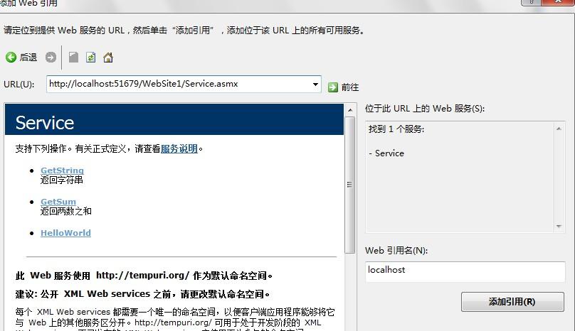 上面的地址 就是刚才我们运行WEBservice 的地址 输入上去 点击前进 右面就会出现 服务名了。再添加引用OK。我们的WEB服务就添加到我们的网站上来了。