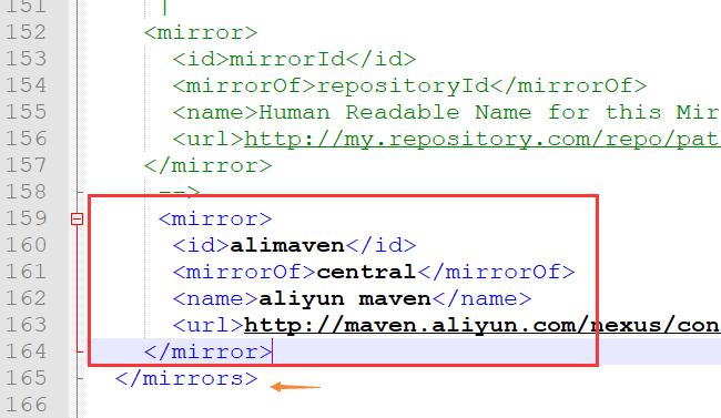 <mirror> <id>alimaven</id> <mirrorOf>central</mirrorOf> <name>aliyun maven</name> <url>http://maven.aliyun.com/nexus/content/groups/public/</url> </mirror>