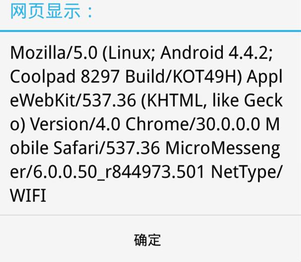 这一下果然还真的看到了不一样的地方,相信聪明的朋友也已经发现了,没错,就是这个东西:MicroMessenger/6.0.0.50_r844973.501,斜杠后面的这一串就是我当前使用的微信的版本号,前面则应该是微信的一个独有标识了。其实我一开始看成了MicroMessage,想着中文翻译过来是“微消息”的意思,但仔细一看发现不是的,后面查了词典才知道Messenger这个词有“报信者,送信者”的意思,也就不觉得奇怪了。这个标识应该来说是其他浏览器不会有的,那么解决方案就来了,请看代码: